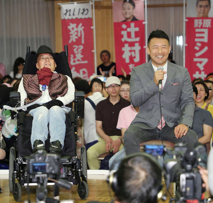 지난 21일 치러진 일본 참의원 선거에서 가장 성공한 인물은 아베 신조 총리가 아니라 배우 출신 정치인 야마모토 다로(45)일 것이다. 그가 결성한 정치단체 ‘레이와 신센구미’는 이번 선거에서 비례대표 2석을 획득했고, 득표율 2%를 넘기면서 정당요건을 충족했다. 비례 1번에 루게릭병 환자인 후나고 야스히코, 비례대표 2번으로 중증장애인 기무라 에이코를 당선시켰다. 비례 3번으로 입후보한 야마모토는 무려 99만표의 전국 최다 득표를 하고도 낙선했지만 ‘레이와 신센구미’가 정식 정당이 된 만큼 당대표 자격으로 정치활동을 이어가게 됐다.